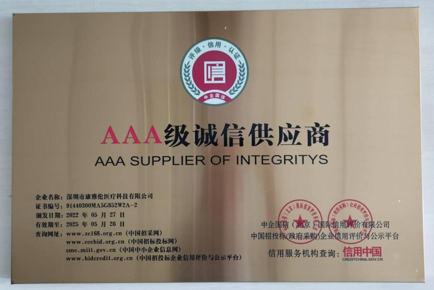 近日,深圳市康雅伦医疗科技有限公司(以下简称 康雅伦医疗),获评“AAA级诚信经营示范单位”、“AAA级诚信供应商”,成为全市同行业中获此殊荣的佼佼者。这充分体现了评审机构和社会各界对康雅伦医疗在依法经营、规范管理、产品质量、服务品牌、社会责任等方面的高度认可与充分肯定。