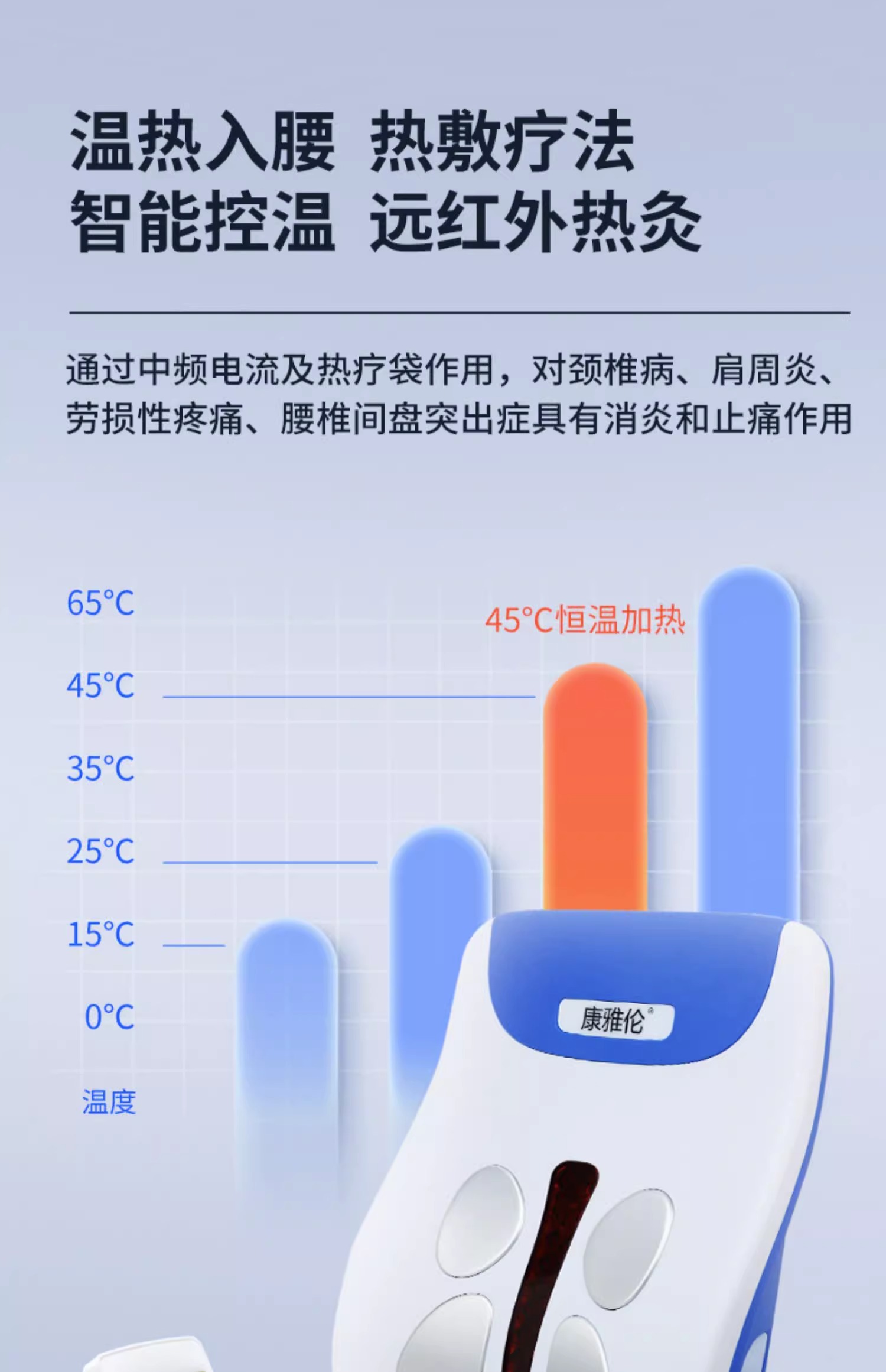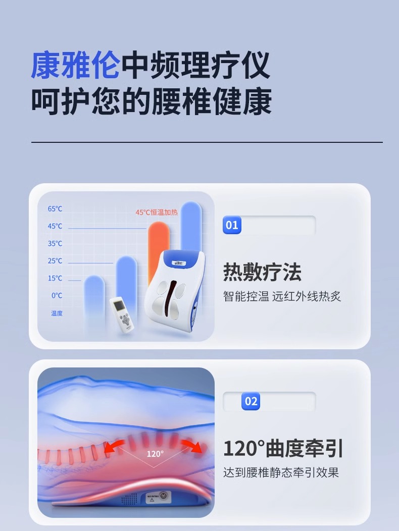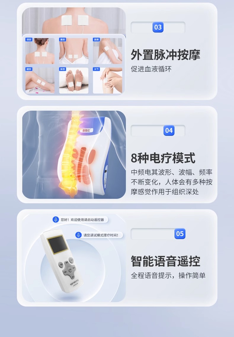 通过中频电流及热疗袋作用,对颈椎病、肩周炎、劳损性疼痛、腰椎间盘突出症具有消炎和止痛作用。