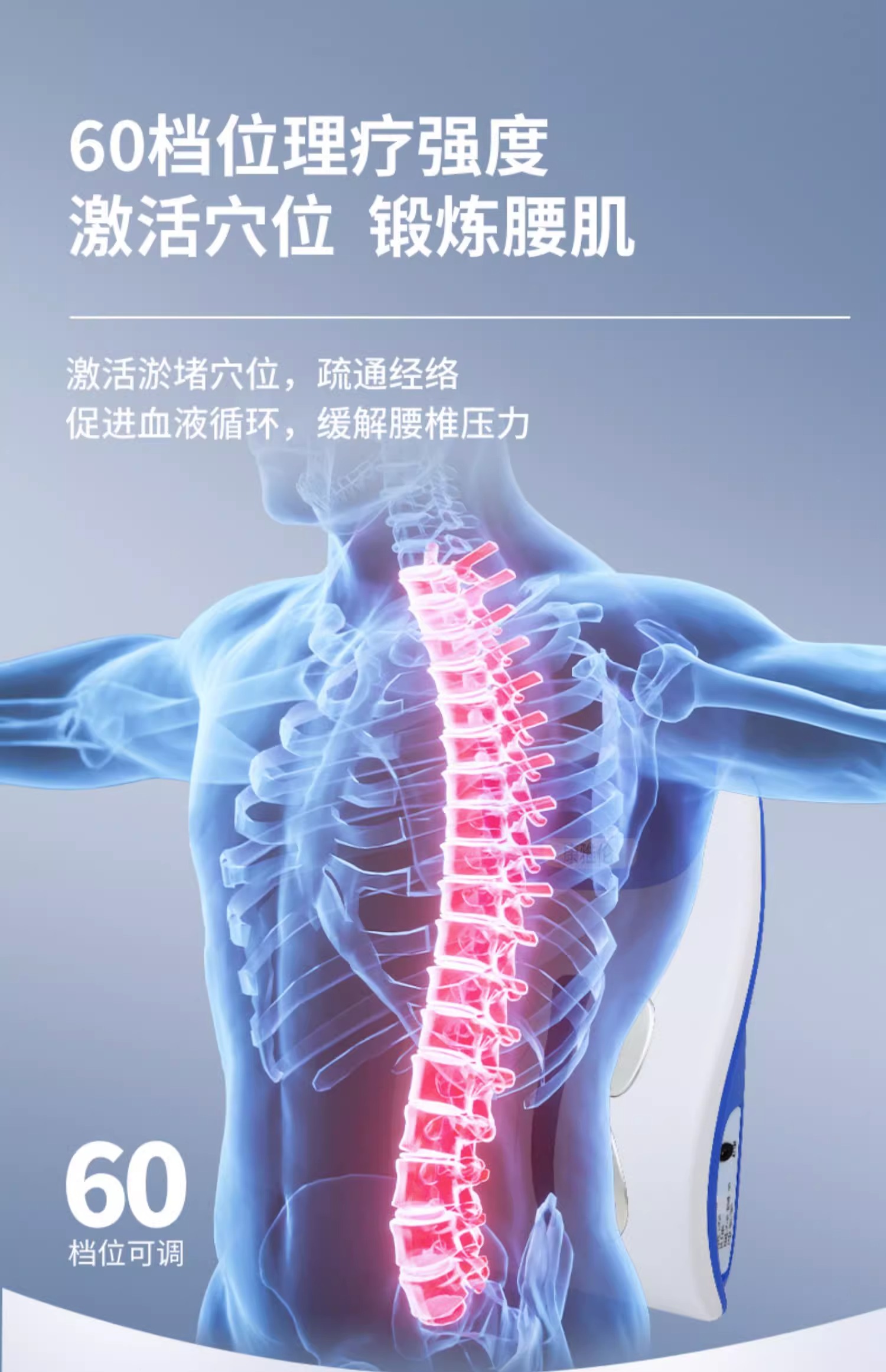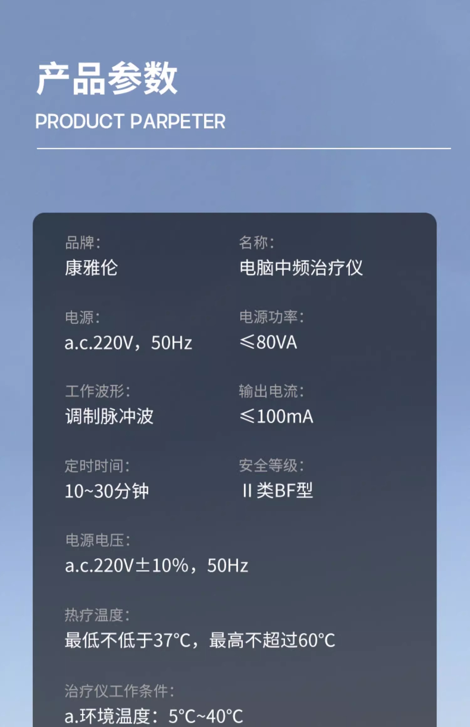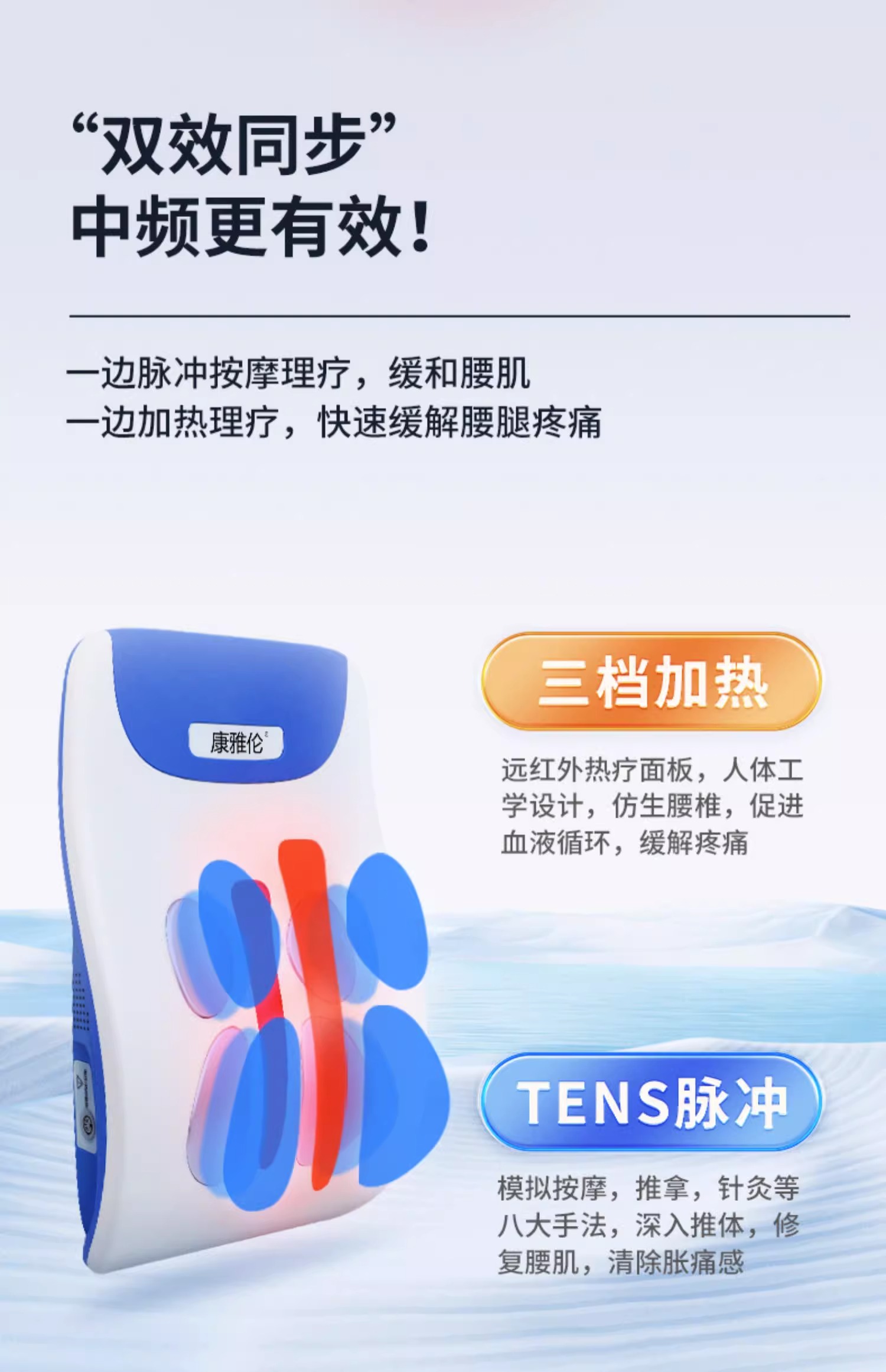 通过中频电流及热疗袋作用,对颈椎病、肩周炎、劳损性疼痛、腰椎间盘突出症具有消炎和止痛作用。